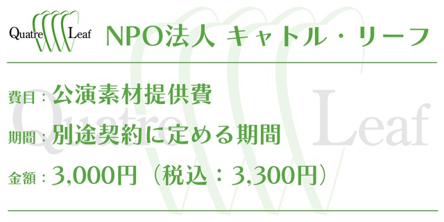 NPO法人キャトル・リーフが提供する、公演素材のご提供費用です。 審査結果通知が届いた日から2週間以内にお支払いをお願いいたします。 お支払いが確認でき次第、素材をお送りいたします。
